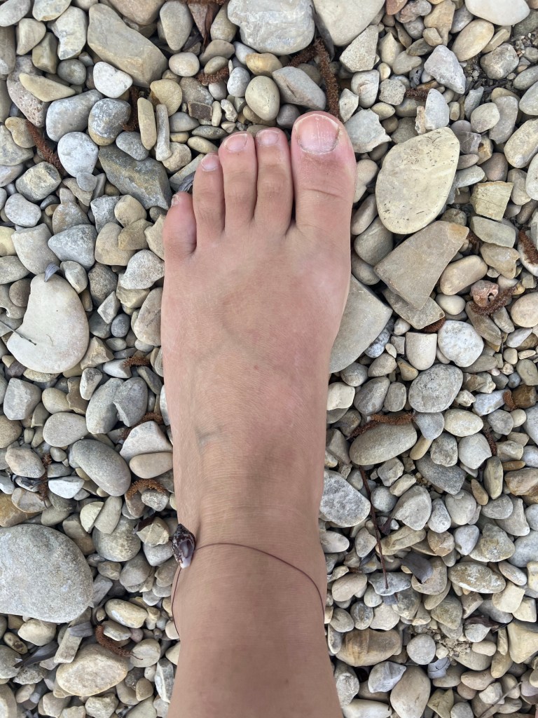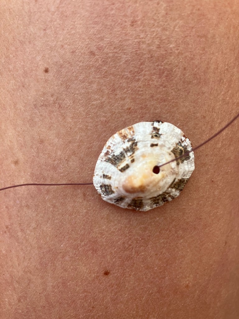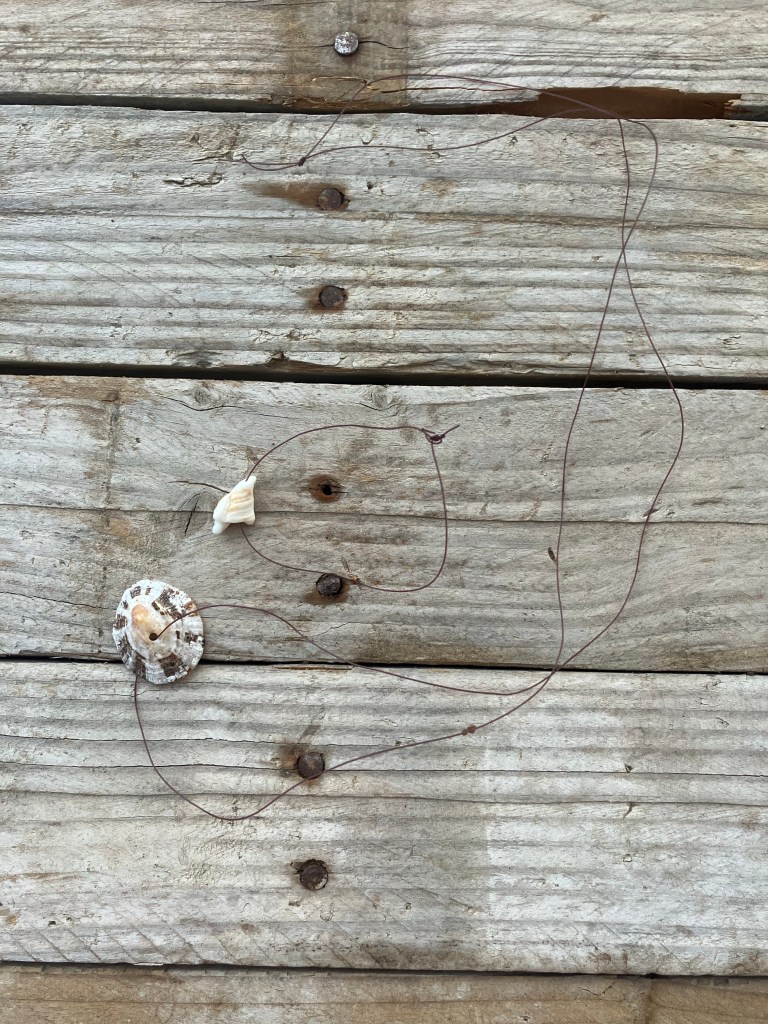 Op vakantie knutselen met vondsten van het strand. Eerst schelpen en vissersdraad gevonden en toen deze sieraasjes gemaakt met Ole.
