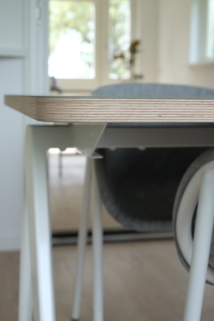 Voor de kantoren in Bunnik en Almere koos ik voor het Galvanitas onderstel van de machinekamer.nl aangezien deze in verschillende maten bestaat en hier een blad met linoleum forbo perfect bij past.