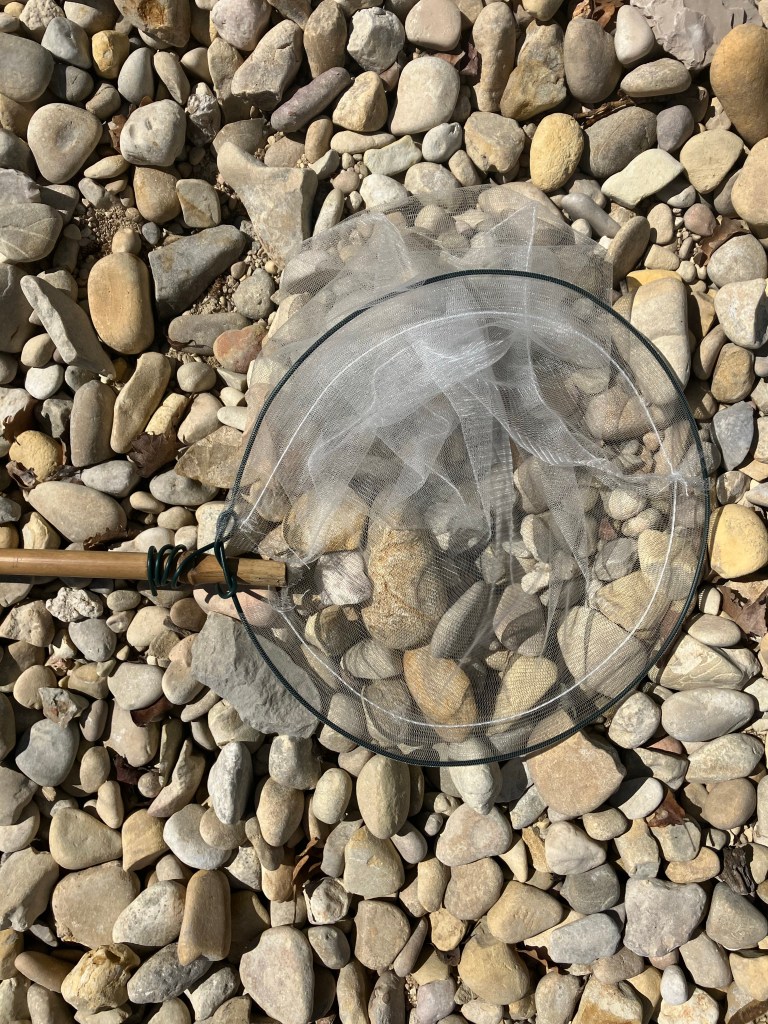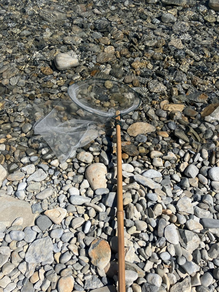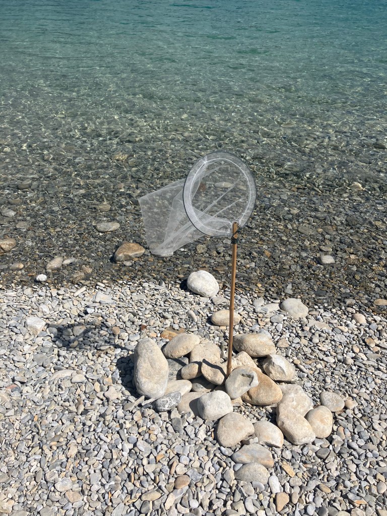 Het leukste blijft om dingen te maken van spullen die je hebt liggen. Zoals een visnetje van een verszakje van de AH en een bamboestok. Gelukkig hebben we ook nog een stuk ijzerdraad gevonden.