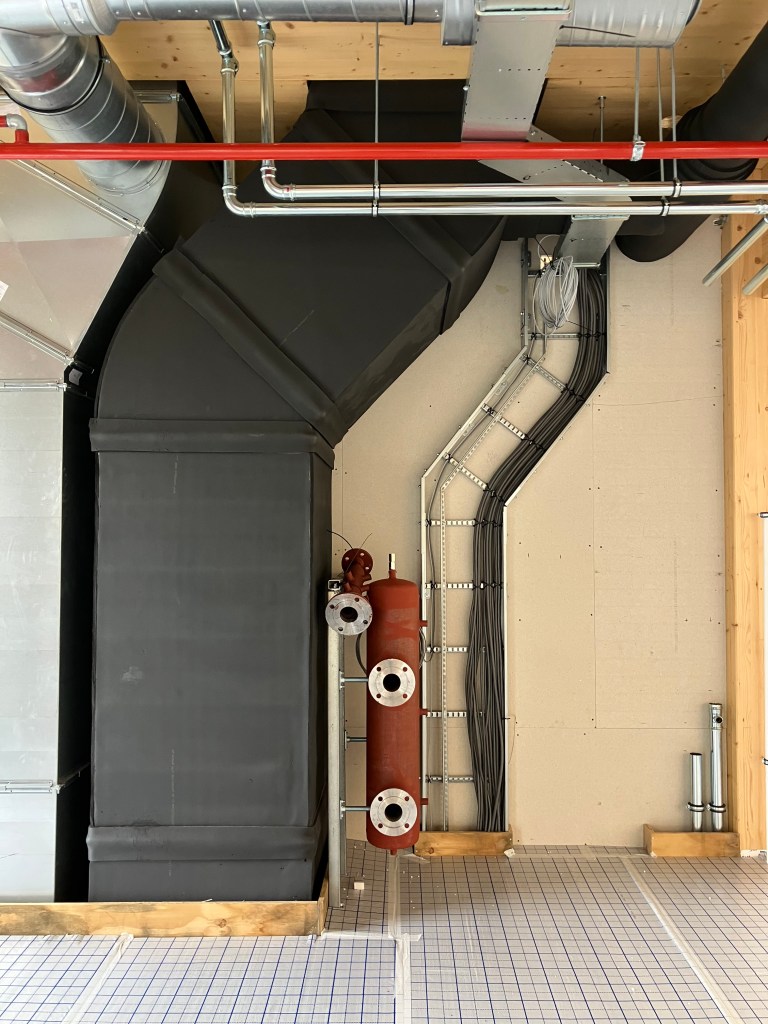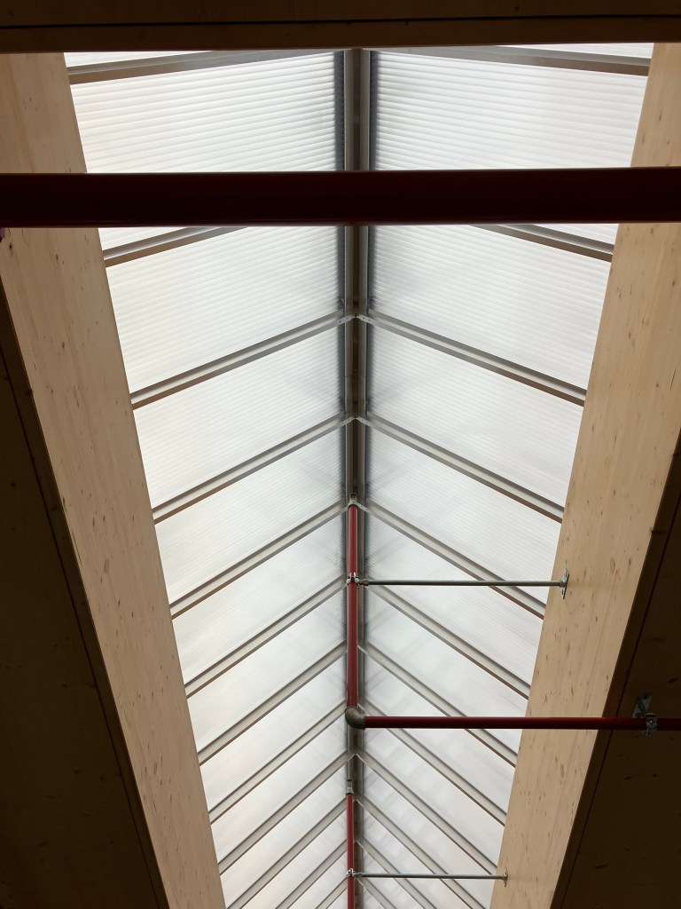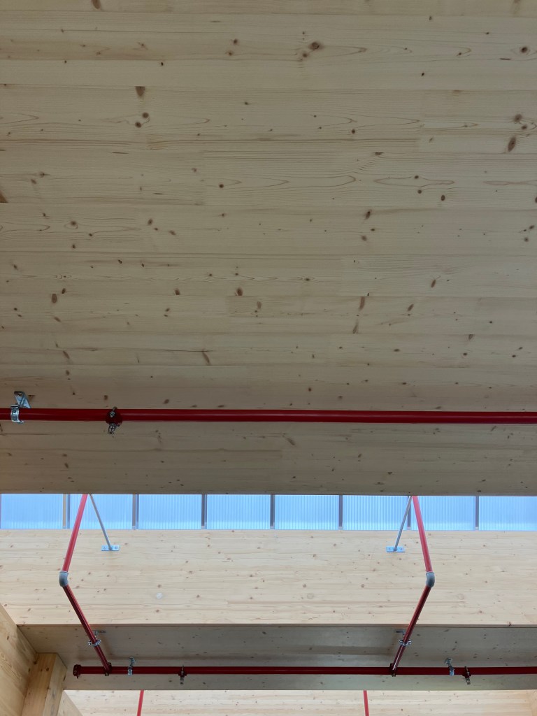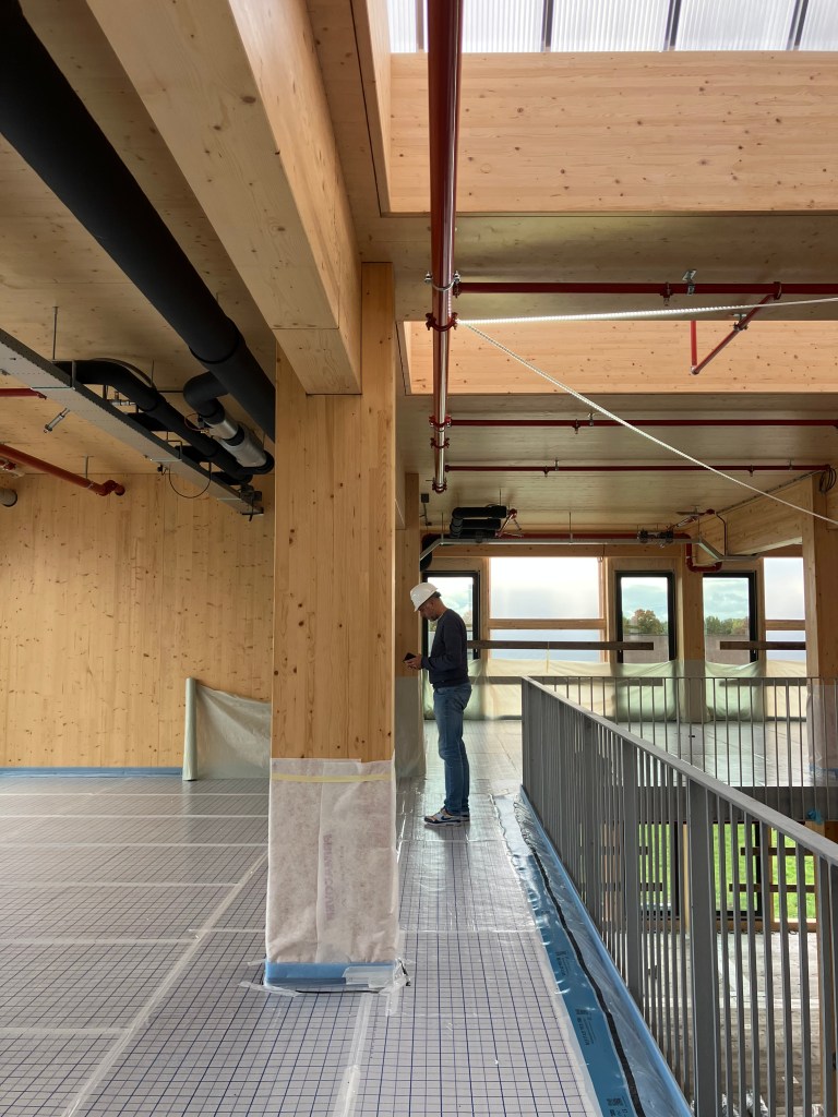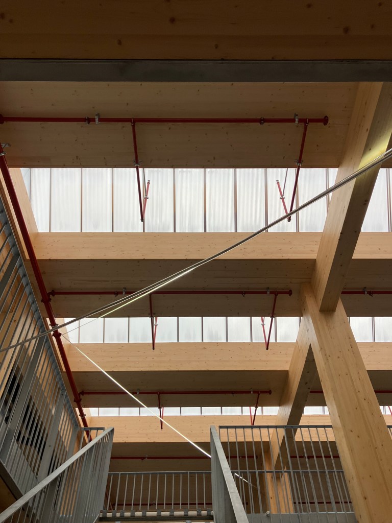 Het houten skelet vormt het uitgangspunt. In het interieur sluiten we daarop aan met rustige, tactiele materialen: linoleum van Forbo voor de bureaus, warme structuren die prettig aanvoelen en rustig samenwerken met het hout. Als tegengewicht voegen we juist aluminium details toe. Die brengen helderheid en spanning in het geheel, zonder de zachtheid van de ruimte te doorbreken.