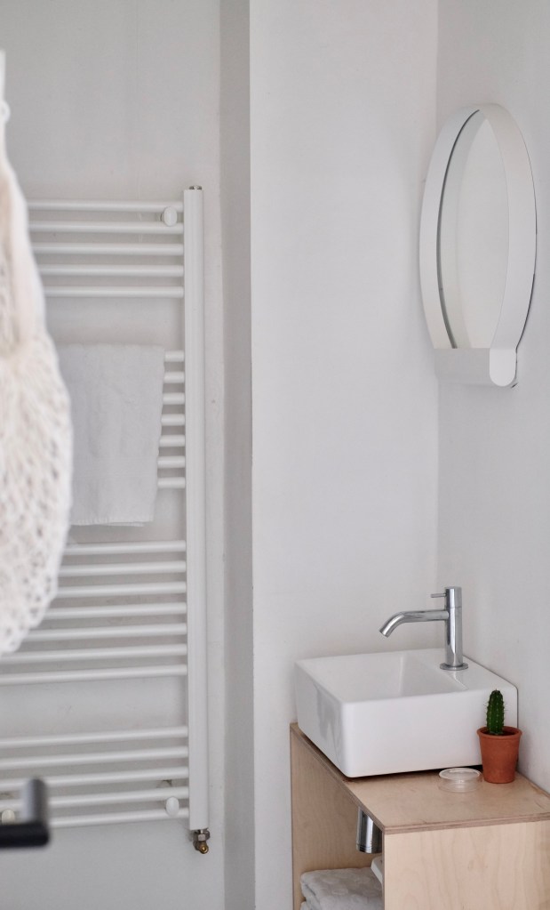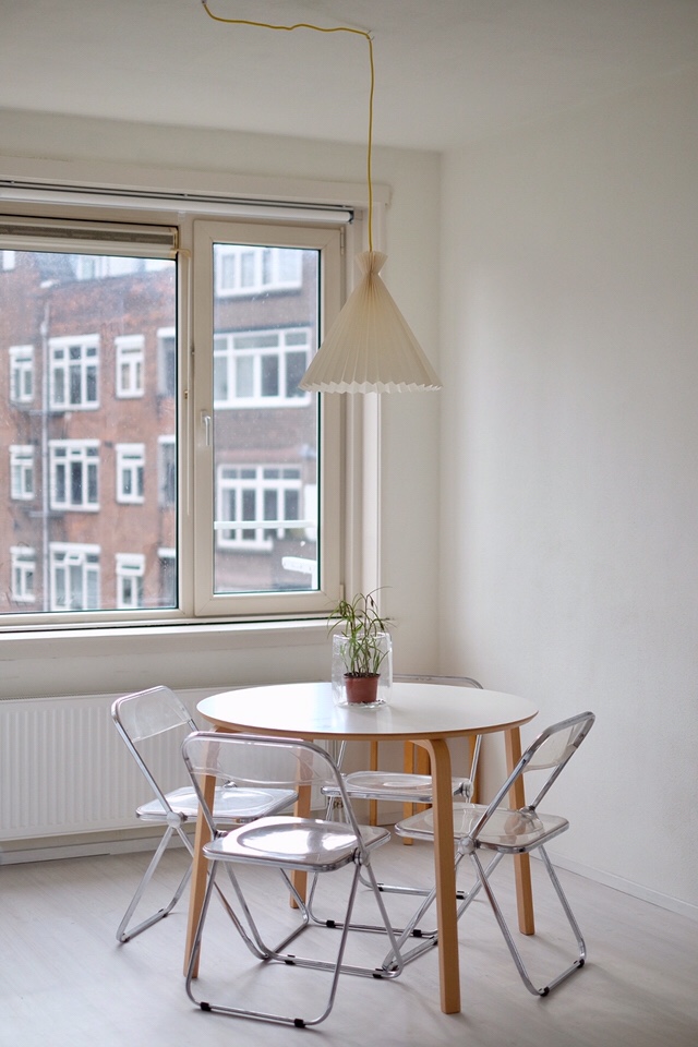 Het Lundia kastje, badkamer- en slaapkamerkastje zijn van restmateriaal van de keuken vervaardigd. De Pastoe schommelstoel en Castelli Plia klapstoeltjes geven het appartement een industriële uitstraling. De Plia eetkamerstoel is een van dé designklassiekers uit de hand van Giancarlo Piretti. Het model werd in 1967 geïntroduceerd op de Salone Di Mobile in Milaan. De interesse was hierbij zo groot, dat de stoelen door het publiek werden meegenomen van de beursstand..! Het tafeltje is van restmateriaal en veiligheidsglas vervaardigd. De stoffen zijn zo veel mogelijk linnen en gewassen katoen in zachte kleuren.