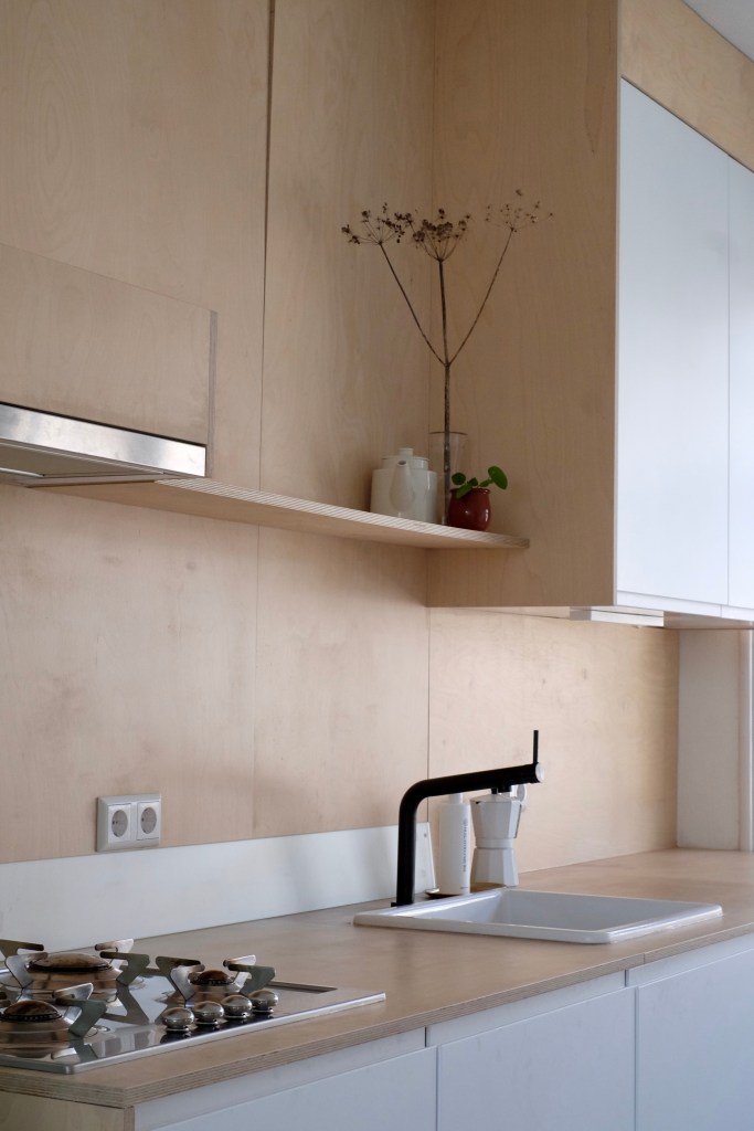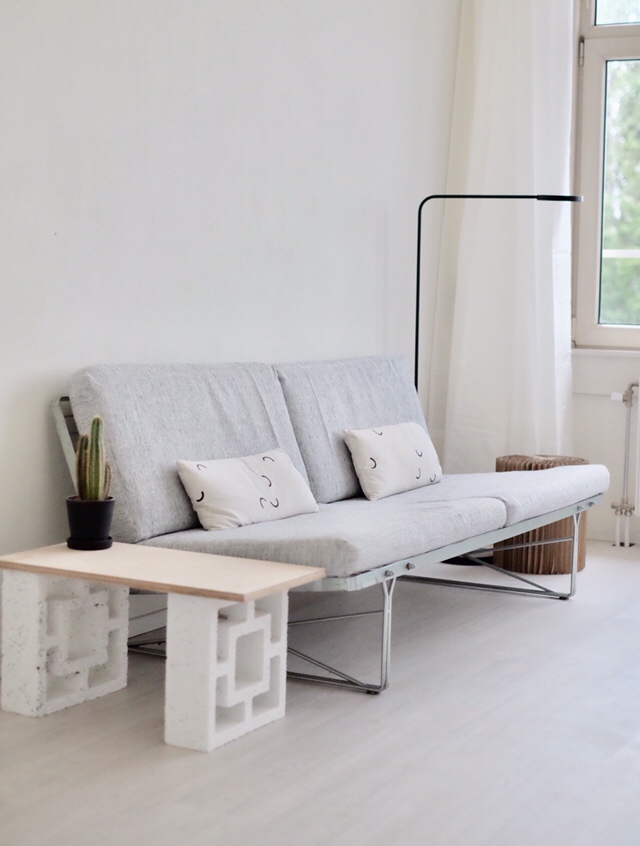Eenvoud Interieur heeft bij dit appartement in Rotterdam de inrichting en materiaal keuze verzorgd. Het budget moest zo laag mogelijk gehouden worden. Daarom hebben we zo veel mogelijk gebruik gemaakt van tweedehands meubels en restmateriaal. De Niels Gammelgaard bank is een vintage item die we hebben gevonden en bekleed hebben met een vintage stof. De Niels Gammelgaard bank is een onderdeel van de serie MOMENT en bestond uit verschillende meubels alsook deze tijdloze bank. Het frame van de bank bestaat uit twee rooster van rvs omlijst door een rvs rand die op hun beurt weer verbonden zijn met twee draadstalen pootconstructies. De keuken is geheel van berken multiplex.